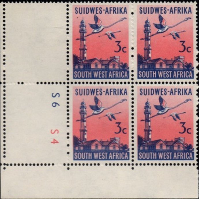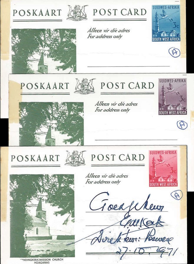 笔者收集有一组西南非洲(南非语Suidwes-Afrika,英语South west africa,今纳米比亚共和国在1915年至1990年间的正式名称,位于非洲大西洋西岸)邮资图为火烈鸟飞过斯瓦科普蒙德(Swakopmund)灯塔、左图为Hoaganas 教堂古建筑的邮资明信片试色印样(图1)。该邮资片邮资图试印样颜色分别为蓝色、棕紫色和玫瑰红三种,并由邮政官员克科克(G de KocK)在被接受的玫瑰红颜色邮资片上签署“Goedgekeur / G de Kock / Direkteur: Poswese / 27.10.1971”审核意见,Goedgekeur是布尔语(南非荷兰语)“批准”的意思。笔者是从南非杰出集邮家理查德·约翰逊(Richard Johnson RDPSA)处购得该组邮品,据称是唯一的(unique)。