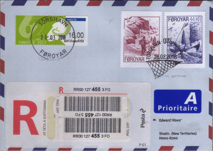 法罗群岛为Intelligent AR自动化邮票贩卖机特别在法国Cartor订印一批《法罗群岛的颜色》(Føroyar í litum),在2017年10月27日邮展首日发行(封面),与原票格式不同。至于原票则仍然在丹麦Limo Labels印刷,图2用例是用以补资最近发行的《捕捉海雀》(Lundafleyg)邮票实寄封。
