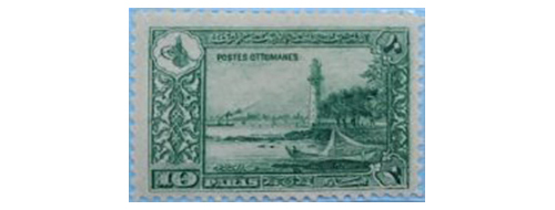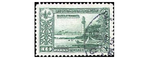 土耳其奥斯曼帝国于1914年1月14日发行君士坦丁堡风光邮票,其中一枚面值10 pa的绿色邮票展现了伊斯坦布尔的Fenerbahce灯塔(图1);1920年,通过重新雕刻设计,又发行相同图案的邮票(图2)。这2种邮票之间有细微变化,后者删除了图案中间邮票铭记下方的土耳其文字。
