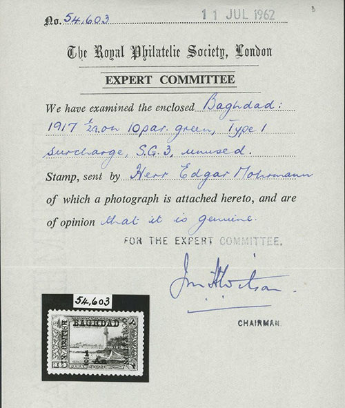 英国占领区邮票临时加盖(provisional overprint)有2种型式(type)。,已知巴格达占领区邮票1917年9月1日发行,斯科特目录号N3,标价相对较高,笔者最近参加捷克布拉格拍卖获得1枚(图3),附有1962年莫尔曼(ex. Mohrmann)专家签署的伦敦RPS证书(图4);伊拉克占领区邮票斯科特目录号N29,笔者收集有双连错体(图5),右边邮票上“IRAQ”的“Q”错误为“O”,附有2001年伦敦BPA证书(图6)。