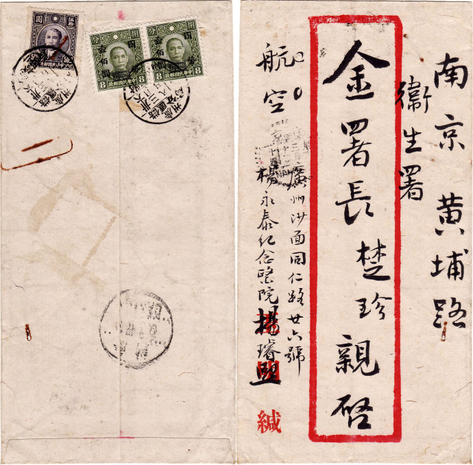 信函1947年3月8日从广州沙面寄往江苏南京,贴邮资国币250元,其中平信邮资100元,航空邮资150元。销“广州储汇分局/卅六年三月八日/附设邮局(二)”三格式中文日戳,另销“广州/9.3.47/CANTON”三格式中英文中转戳,到达南京后销“南京/卅六年三月二/NANKING”落地戳。此为储汇局戳式“附设邮局 二”比较少的用于国内邮件之例。