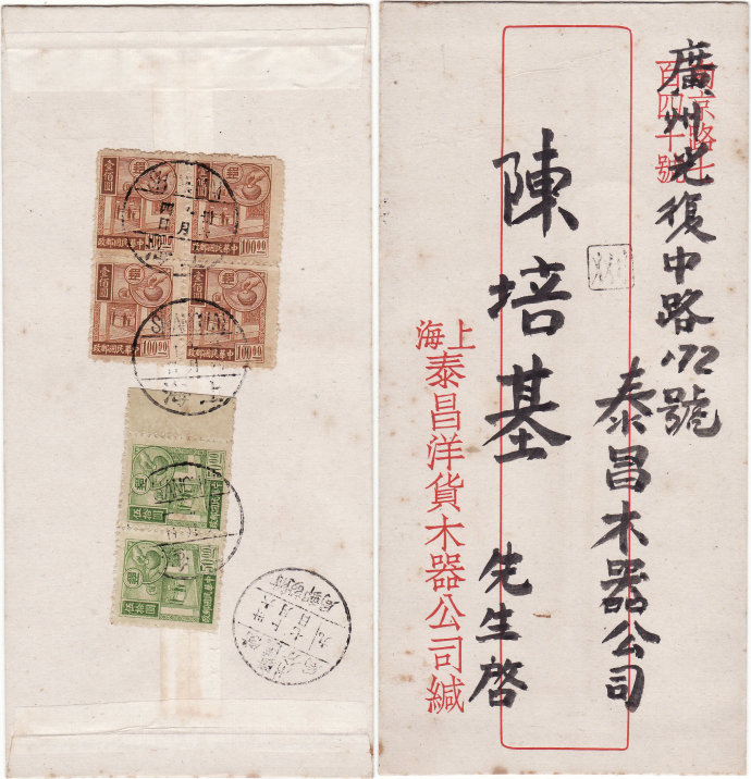 信函1947年10月4日从上海寄往广州,贴邮资国币500元,其中平信邮资500元。销“SHANGHAI/卅六十月四日/上海”三格式中英文日戳,于10月7日到广州,销“广州储汇分局/卅六年十月七日/附设邮局”落地戳。此储汇局戳式“附设邮局 ”是非常少见的,目前未发现此戳用于销票。