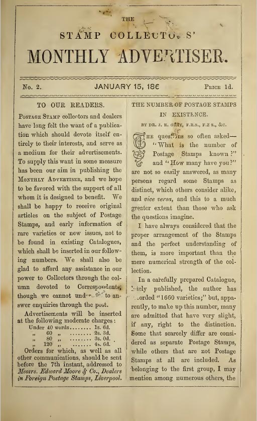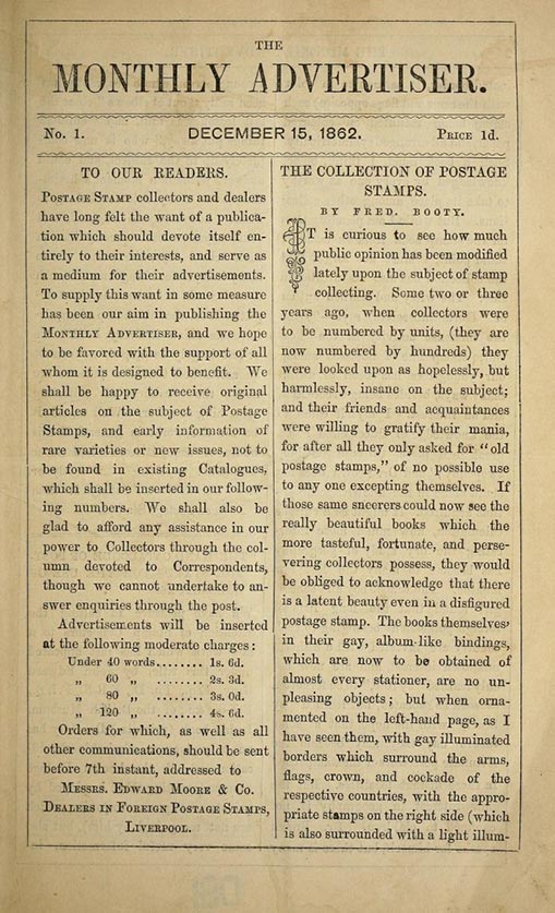 第一种专门面向集邮者发行的集邮期刊,1862年12月15日在英国利物浦创刊,刊名为The Monthly Advertiser(《广告月刊》),出版者是专门经销外国邮票的邮商——爱德华·莫尔公司(Edward Moore & Co.)。封面图为创刊号封面,左栏致读者的发刊词表明,此刊将专注于满足集邮者和邮商的需求,意在成为两者交流的媒介。此刊主要刊载原创的邮票主题文章,早期珍品信息,各国新邮发行报道,邮票目录以外新发现品种。头版右栏文章题为《收集邮票》,作者波蒂(Frederick William Booty,1840-1922),就是1862年4月出版英国第一种邮票目录的编著者(参见151133)。第2-5页介绍格雷博士当月新出版的邮票目录《集邮者使用的邮票目录手册》(参见151133)。第5-8页是集邮者、邮商的征购和销售广告,其中包括出版者自己公司的2条广告,内容一是销售外国邮票,另一是经销几种邮票目录和拉利埃邮票簿,包括比利时邮商莫昂编印的第2版邮票目录,波蒂编著的插图版邮票目录。从第8页刊载的经销处名单看,此刊当时在英国12个城市设立13个代销点。