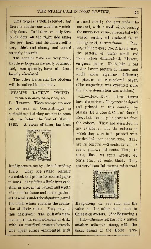 同年2月15日出版第3期,再次更改刊名为The Stamp-Collectors’ Review and Monthly Advertise(《集邮者评论和广告月刊》)(图3),调整版面结构比重,邮文份量明显增加,开始增添邮票插图,呈现图文并茂,页面从此扩增到每期16页,售价也由1便士涨到2便士。第18页刊登《我们邮政文献的评论》,点评当时英国业已出版发行的几种邮票目录。第23页首次刊载世界各国和地区新邮发行信息,内有1862年12月发行的香港首套邮票信息,由英国德纳罗公司设计印制(图4,右栏)。