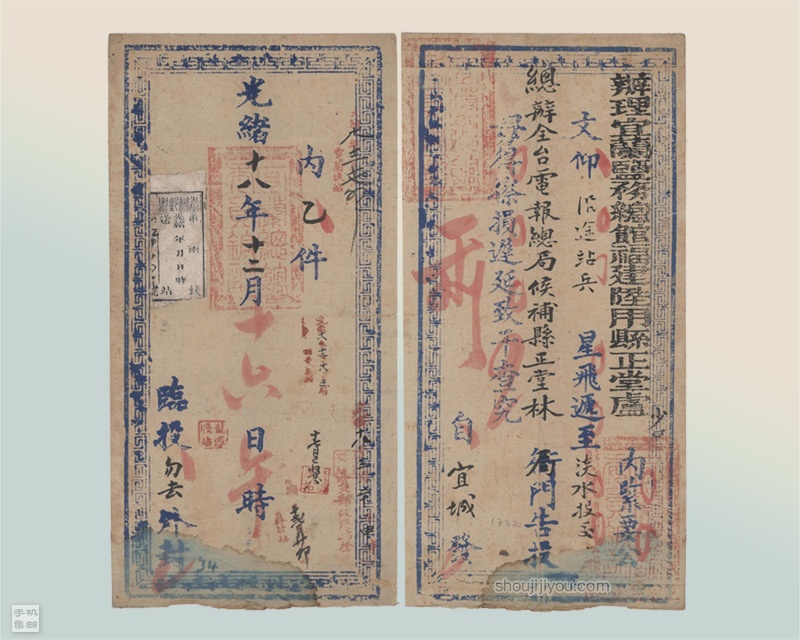 图2是光绪十八年(1892)贰月初三日,台湾巡抚致旗后海关委员公文的封套,从台北到旗后(高雄),走南北邮路,共经17站,十一日到,沿途各驿站均有记录到达时刻并钤用条戳或印记。