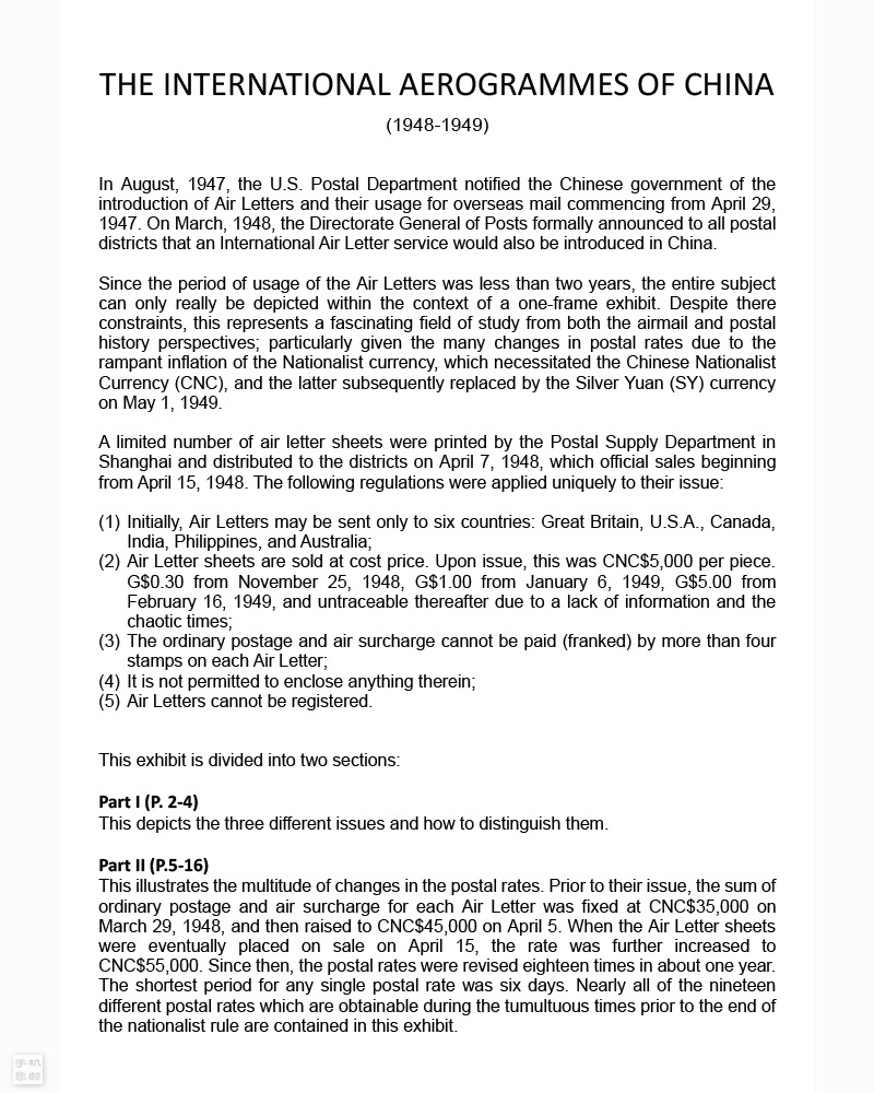 陆游《中国国际航空邮简(1948-1949)》一框邮集简介:中国国际航空邮简(1948-1949)这段特殊时期的邮政历史,完整记录了中国首次引入国际航空邮简服务的全过程。1947年8月,美国邮政部门通知中国政府配合新资费建议发行航空信简,中华民国邮政总局于1948年3月正式推出这项国际服务。由于实际使用时间不足两年,这段历史特别适合以单框展集的形式呈现。上海邮政供应处1948年4月7日印制了首批航空邮简,4月15日正式发售,其使用遵循严格规定:仅限寄往英美等六国、按成本价销售(从最初的法币5000元历经多次调价)、加贴邮资不得超过4枚邮票、禁止内附物品且不可挂号。展集分为两部分:第一部分展示三种版式的鉴别特征;第二部分详述邮资的18次调整过程,从1948年3月的法币35000元到次年4月的55000元,最短执行周期仅6天,完整呈现了国民政府货币恶性通胀时期(法币CNC到银圆券SY的转换)的邮政费率变迁,几乎囊括了该时期全部19种邮资实例,具有重要的航空邮政史研究价值。