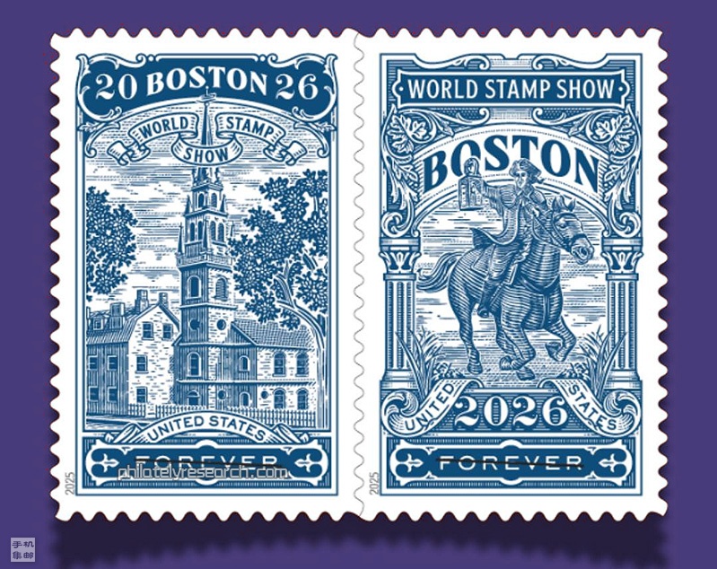 波士顿2026世界邮票博览会BOSTON 2026定于2026年5月23日至5月30日在美国波士顿举行,展览获国际集邮联FIP、美洲集邮联FIAF和欧洲集邮联FEPA的赞助,为纪念美国独立250周年而举办,邮展设非竞赛类和竞赛类包括:非竞赛、冠军类、首日封、传统、邮政历史、邮政用品、航空和航天、专题、开放、极限集邮、印花、现代集邮、图画明信片、一框、青少年、集邮文献。展览规模4000框,波士顿2026世界邮博会纪念邮票于当地时间2025年8月14日上午11点,在美国伊利诺伊州绍姆堡会议中心万丽酒店GASS2025开幕日举行的首发仪式,图案为独立战争时期波士顿旧北教堂和身着知名时期服饰策马扬鞭的午夜骑士,面值78美分(图1、图2),目前已有近60个国家和地区征集员确认参展,截止发稿前组委会收到的国际评审申请已有71位,组委会公布的征集员有64位(包括美国3名印度2名),这是美国举办的第12届国际邮展,邮展主席亚米尔·库里在最新的理事会会议上,公布了最新进展,已募资98.9万美元,到账87.7万美元,展览摊位已售出99个,8个国家和地区的邮政机构参展,目前已征集286部展品,邮展报名通过网上报名和各国邮协征集员确认进行申报,完整报名表需于2025年9月30日前提交,申请人需在2026年1月15日前提供FIP认可的外语(英文、法文、德语或西班牙语)前言页。参展费多框每框125美元,一框195美元,文献为65美元,文献需最迟在2026年2月28日前提供资料,以便进行初审。