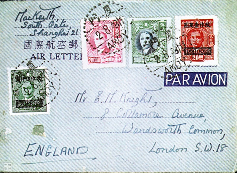 如图1/2所示,1948年8月2日由厦门寄英国,贴4枚邮票,合计85000元,另盖“8月5日”香港中转戳。如按照1948年8月1日~8月20日期间国际航空邮简邮资计算,该邮简邮资应为法币250000元,但该邮简实际邮资力1948年5月19日~7月31日期间的85000元。