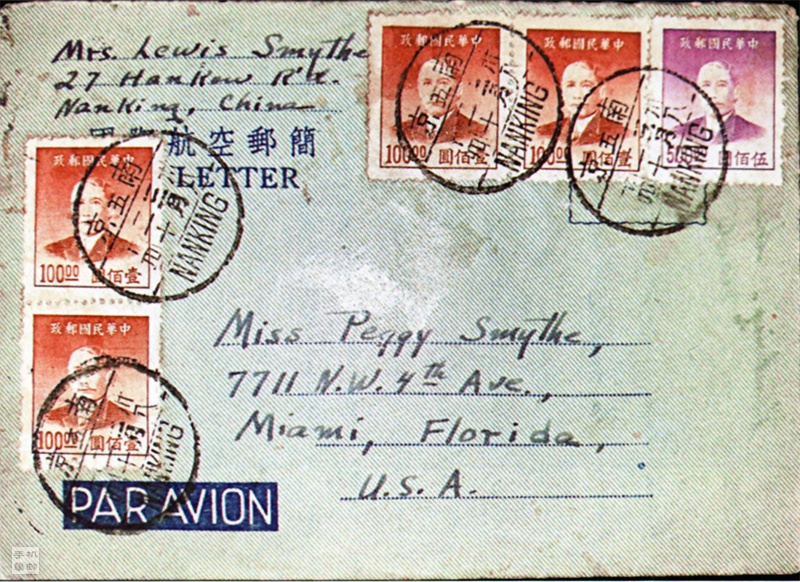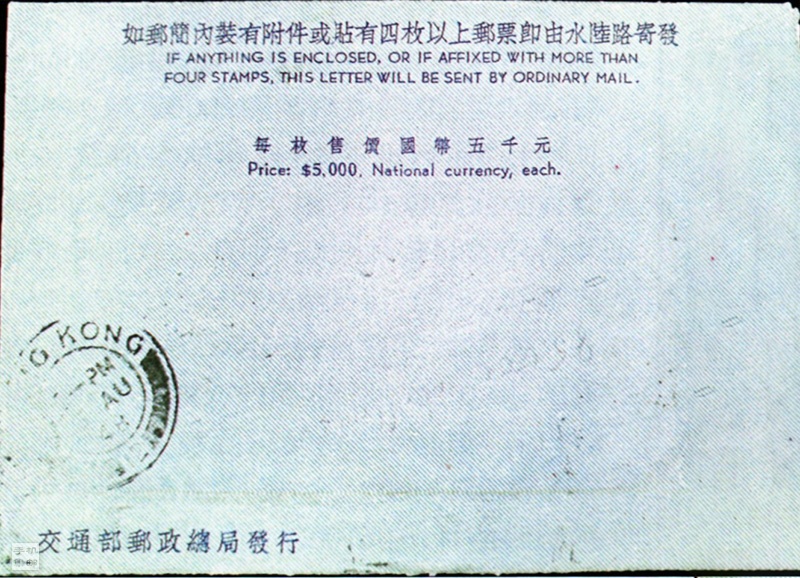 如图3/4所示,1949年3月20日由南京寄美国,贴5枚邮票,合计900元。如按照1949年3月11日~3月20日期间邮资计算,国际航空邮简应为邮资金元850元,但该邮简溢贴50元,为调资尾日。