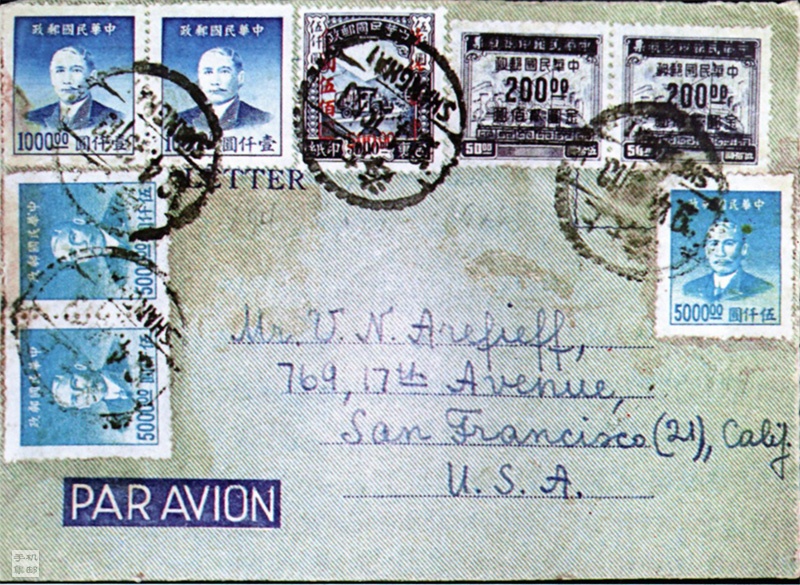 如图5/6所示,1949年4月19日由上海寄美国,贴9枚邮票,合计22900元。如按照1949年4月17日~4月28日期间国际航空邮简邮资应为金元21000元,但该邮简溢贴1900元。推测该简预贴2900元(1949年4月1日~4月10日期间国际航空邮简为邮资为金元2900元),由于调整资费,寄件人另贴5000元邮票4枚,因此造成如此混乱的邮资。