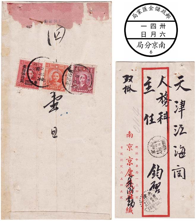 信函1947年4月1日从江苏南京寄往天津,贴邮资国币400元,其中平信邮资100元,挂号邮资150元,回执邮资150元。销“邮政储金汇业局/卅六年四月一日/南京分局6”三格式中文日戳,另有“南(六)京卅六年四月一日/NANKING” 三格式中英文邮局中转戳,于4月3日到天津,销“天津/卅六年四月三日/TIENTSIN” 三格式中英文落地戳。