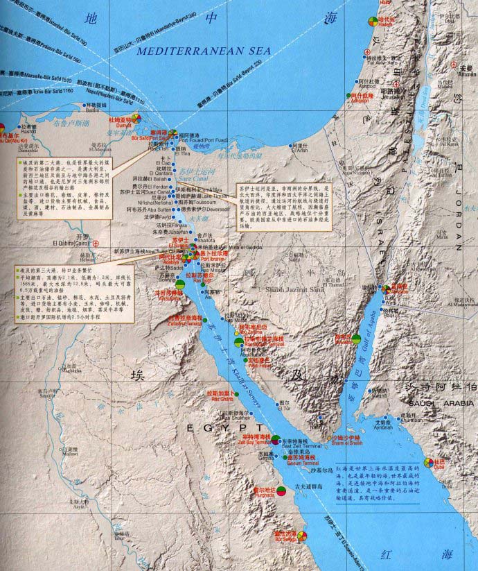 苏伊士运河全长175公里,宽135米,水深13米。运河虽小,却是欧亚非洲的分界和交通要道,在国际航运史上举足轻重。苏伊士运河北边的塞得港(Port Said)通地中海,南边的苏伊士港(Port Suez) 以前叫塔菲克港(Port Taufiq),通过红海进入印度洋(图1)。