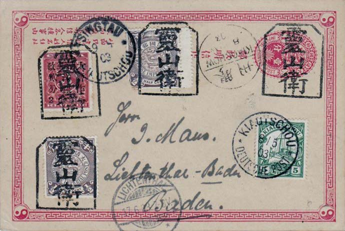 图4为1903年6月22日天津贴3枚10k俄国邮票,3枚1角蟠龙邮票分别盖俄国13野战邮局日戳和天津6月22日汉英戳寄德国的挂号封,双倍邮资。6月26日牛庄转口,7月16日到德国,邮程20天!信封正上方有“Via Siberia”字样。这是西伯利亚大铁路1903年10月23日正式通车前经西伯利亚邮路的信件。