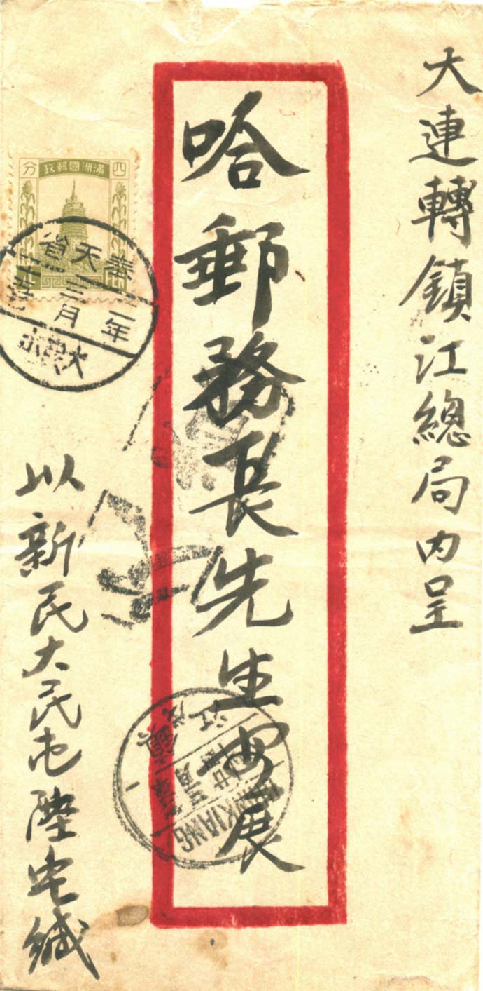 如图所示,为1933年3月15日由奉天寄往镇江的中式红框封,正贴伪满4分邮票一枚,销大同二年三月十五日奉天省大民屯三格式实线日戳。该封明确写明邮路指示为“大连转”。