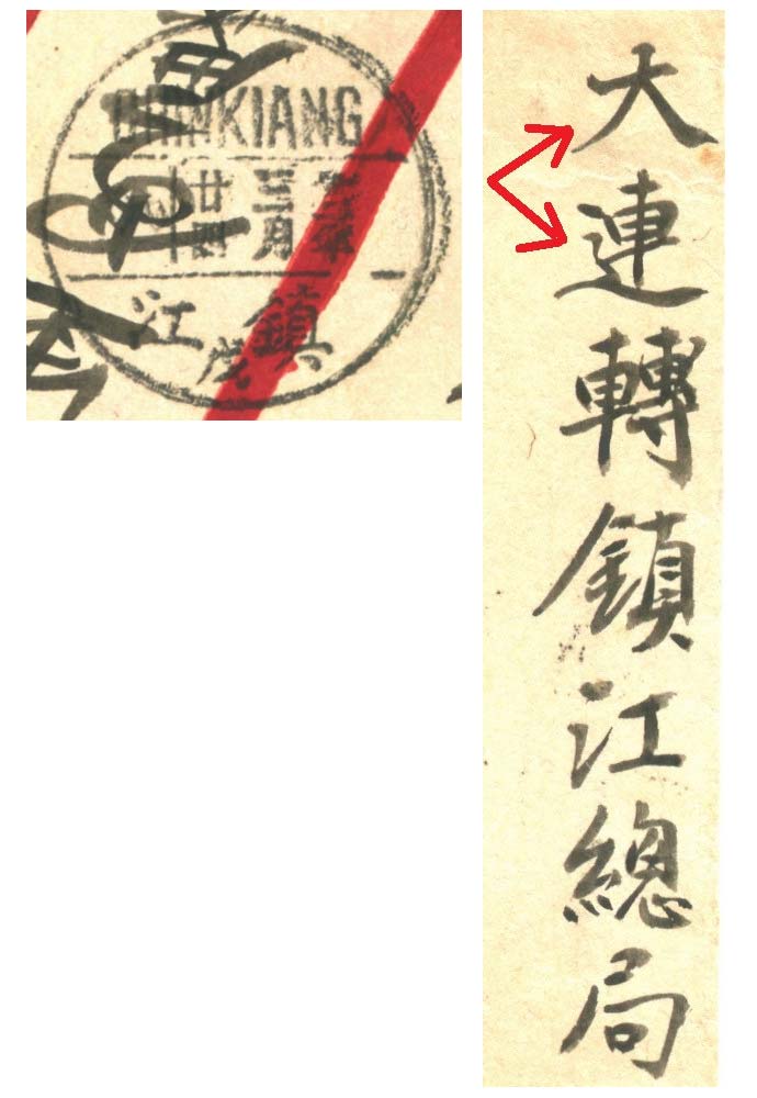 该封应由海路发运,并于1933年3月24日到达镇江,销镇江英汉文三格实线到达日戳,邮程为9天时间。
