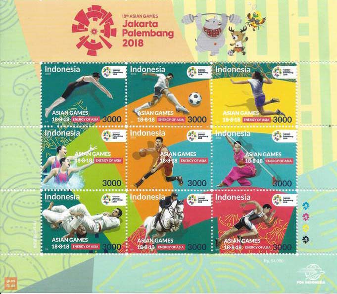 第18届亚洲运动会于2018年08月18日至2018年09月02日在印度尼西亚雅加达举行,发行多种邮品,另一个城市巨港协办足球和网球赛事。雅加达曾于1962年举办第4届亚运会。雅加达亚运会设40项比赛项目,包括32个奥运项目和8个非奥项目,中国选手在此次比赛中获得132块金牌,92块银牌,65块铜牌,位列奖牌榜首位。是继曼谷、新德里后第三个取得第二次亚运会主办权的首都城市。