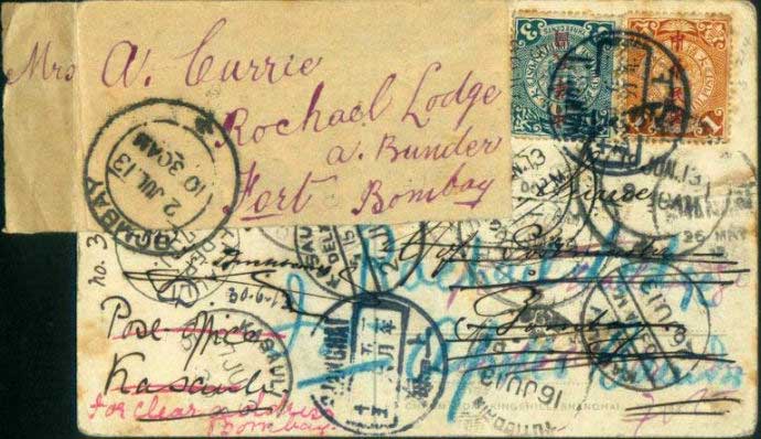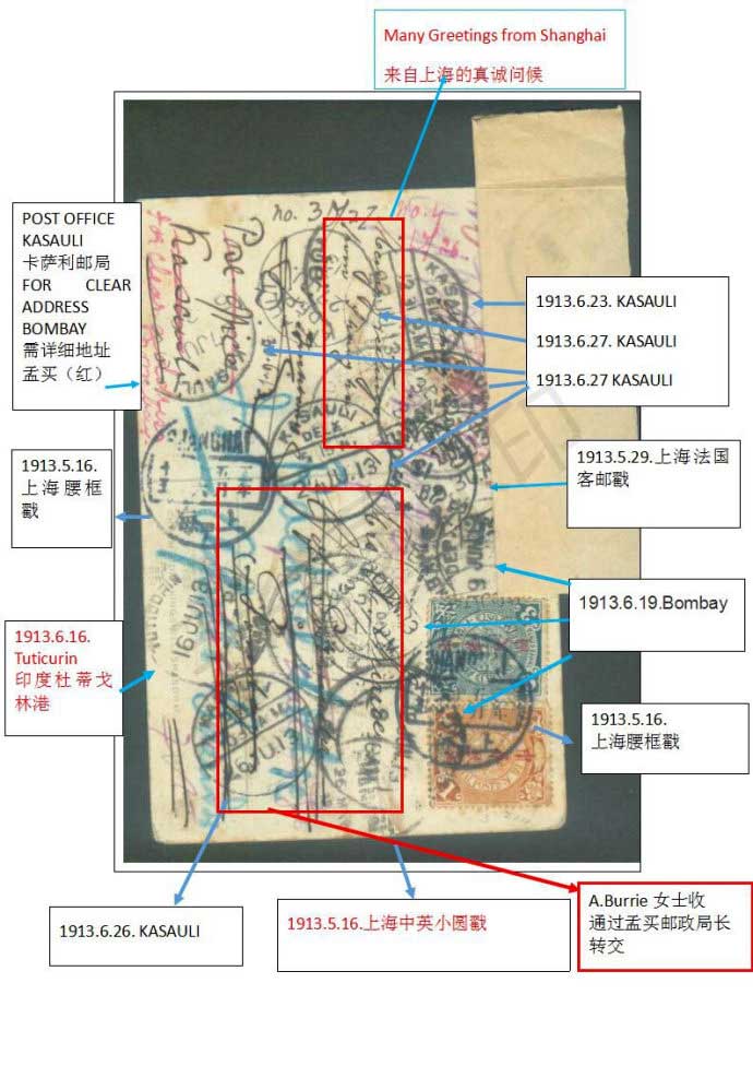 该片于1913年5月16日由上海寄出,转上海法国邮局出口,经海路于6月16日到达印度的杜蒂戈林港。再至孟买,因收件人不在孟买,又转至卡萨利,在卡萨利也找不到收件人,又退回到孟买。
