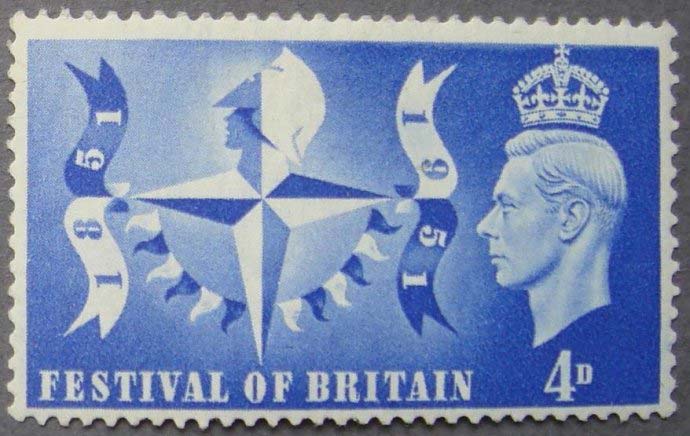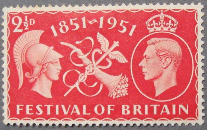 从上述可以得知英国邮票一直使用君主头像或君主头像徽志作为其标志,是无铭记邮票, 到目前为止,英国是世界上唯一一个在邮票上没有显示国名的国家,并已经被人们自然而然地接受了,这是英国黑便士邮票发行以来一直的常规做法。但是,在其邮票发行史中也有不常规的事发生,那就是在其邮票上也曾出现过“国名” 。在1951年5月3日英国发行了带有 “英国”(Britain)字样的邮票,也正是这一天,英国邮票上不显示“国名”的做法被打破了,1952年出版的《大英帝国邮票百科全书,1661年至1951年》第一卷第136页(P136,THE ENCYCLOPAEDIA OF BRITISH EMPIRE POSTAGE STAMPS,1661-1951,VOLUME 1)对此有描述。当天发行了两枚纪念邮票,在上面印有“FESTIVAL OF BRITAIN”(英国的节日)字样,一枚2 1/2D(2.5便士)的朱红色的纪念邮票(图1),其主题为“商业和繁荣”(Commerce and Prosperity),另一枚为4D(4便士)的深蓝色纪念邮票(图2), 主题为 “节日的象征”(Festival Symbol),两枚邮票的齿度为P15X14,这是英国黑便士邮票诞生110多年以来第一次在英国邮票上出现“国名”的邮票。