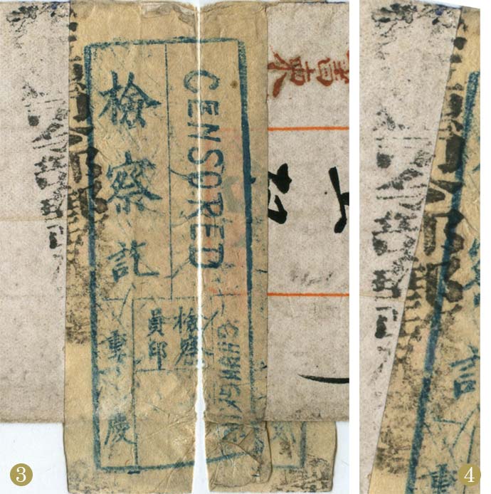 该封在经由重庆中转时,在邮局接受军方驻局检查人员的开封检查,并贴有一枚印有“检察讫 CENSORED 重庆 CHUNGKING 检察员印”文字的检查条(图3),同时骑缝盖有一枚竖条无框型检查戳“督(?)军总司令部邮政检查员”检查戳(图4)。