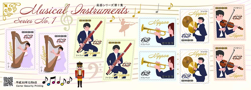 日本2018年12月6日发行“乐器系列”邮票,分62日元和82日元2个小版15种图案(图3、4),62日元图案依次为10-1竖琴;10-2巴松管;10-3小号;10-4铜钹;10-5小提琴。82 日元图案为:10-1竖琴(封面图1);10-2钢片琴;10-3长号;10-4法国号(图2);10-5定音鼓;10-6小提琴;10-7长笛、短笛;10-8单簧管;10-9大提琴;10-10低音提琴。