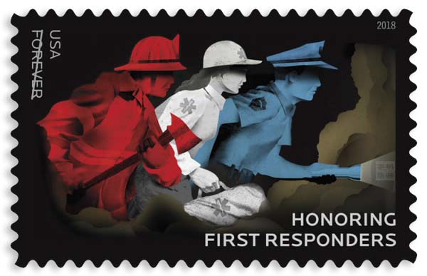 美国2018年9月13日发行“致敬一线抢险员”邮票,面值55¢(约合4元人民币),消防员、医护人员和警察都是冒着生命危险保护人民性命财产的伟大工作者,邮票通过色彩化、图案化方式展现了这些勇士奉献自我,勇闯危局的职业素养和崇高品德。自左向右依次是手持斧子、头戴消防帽的红色消防员正赶往现场的身影,手持急救包、头戴医护帽的白色医护人员正迈步向现场,手持手电筒的蓝色警察正准备应对突发情况。正因为他们的忘我付出,才有今天社会的长治久安。纪念戳采用三种执勤车辆,从左到右依次是警车、消防车、救护车。