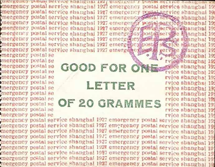 上海邮务管理局与工部局当年还曾商议印售使用邮资券,作为应对措施,但最终没有付诸实施。图3就是券面印满“emergency postal service shanghai 1927”底纹的邮资券,券面中央印有“GOOD FOR ONE LETTER OF 20 GRAMMES”(适用于一封20克信件),并加盖紫色“EPS”小圆戳,显然专门准备用于寄递国际平信。这一措施后在1932年上海邮局职工再次罢工时施行,日后有机会时将另文专述。
