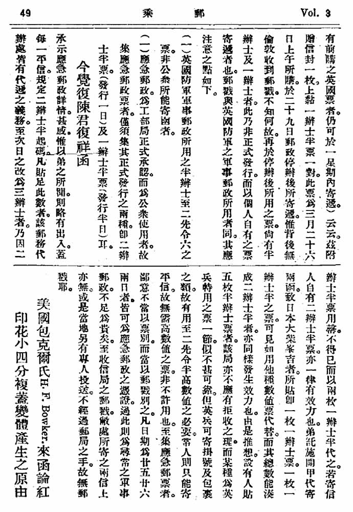 上述事件发生后,还引出一段周今觉与陈复祥关于临时邮政的笔谈。陈复祥见到《邮乘》刊出《客邮其复活乎》一文后,致函周今觉,补充告知临时邮政详情,因临时邮局首日售罄2.5便士邮票,次日改为每元可购1.5便士邮票7对,但每件信函须贴1.5便士邮票1对(2枚)。虽然中国邮局已经复工,临时邮局关闭且不再出售英国邮票,但仍可于一星期内使用。并附赠贴用3月26日上午所购1对1.5便士邮票,且在29日寄发到英国伦敦的实寄封。周今觉收到陈函后回复,更正其一些说法,还讲到没有必要去收集临时邮局出售的英国邮票,而“当以邮戳别之,凡日期为廿五廿六两日者,皆可为应急邮政之凭证。过此则为寻常之军事邮政,不足为贵矣”(图1)。他们两人往来书信的主要内容,刊登在同年9月20日出版的《邮乘》第3卷第2号。图2为印有寄件单位为榆林路70号 “The Express Cigarette Co.”的烟草公司的实寄封,就是贴用1对1.5便士邮票,销票日期为3月29日,封面注明经西伯利亚邮路发运,封背有4月5日香港和4月13日哈尔滨中转邮戳,可以印证上述记载。