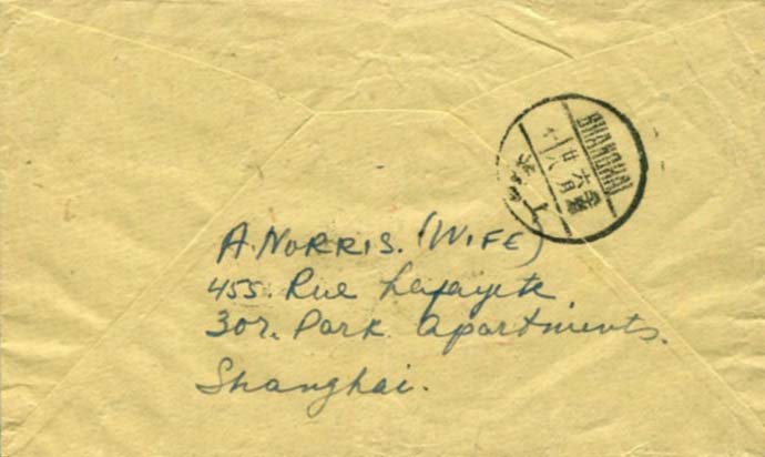 如图所示,为1945年6月24日由上海寄本埠浦东的西式封,该封收件人为是被关押在CIVIL ASSENMBLY CENTRE, POOTUNG(浦东集中营)的G.诺里斯先生。而寄件人为诺里斯先生的夫人。