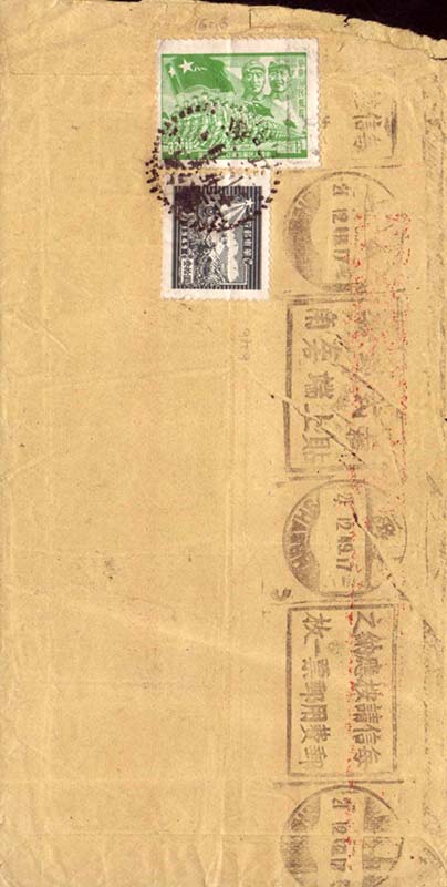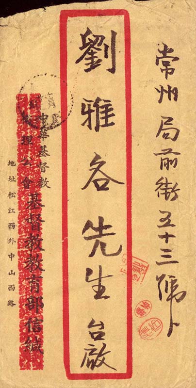 1949年12月21日由上海松江西外中山西路中华基督教卫理公会基督教教育部寄往常州局前街刘雅各先生的中式红框封。背的面贴中国人民解放军廿二周年纪念邮票370元一枚、华东邮政邮运图30元邮票一枚,合计邮资400元,销“江苏 卅八 十二月 廿一 松江”三格式点式日戳,当天即经上海转,销17时上海机盖邮政宣传戳中转,机盖邮政宣传戳文字为“每信请按应纳之邮费用邮票一枚”、“直横式封套贴上端左右角”。