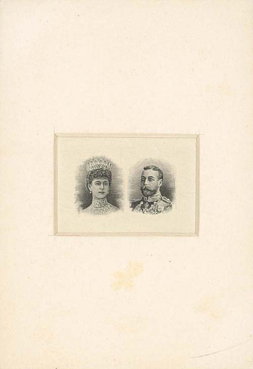 1号拍品是尚未淬火硬化母模的黑色雕刻印样,无边框的双头像主图(图1),规格69×98毫米,成交价43200英镑(含20%佣金)约合38.4万人民币。它与加拿大的那套邮票一样,两人肖像都源自摄影师唐尼(W. & D. Downey)的照片,但有一些明显差别。