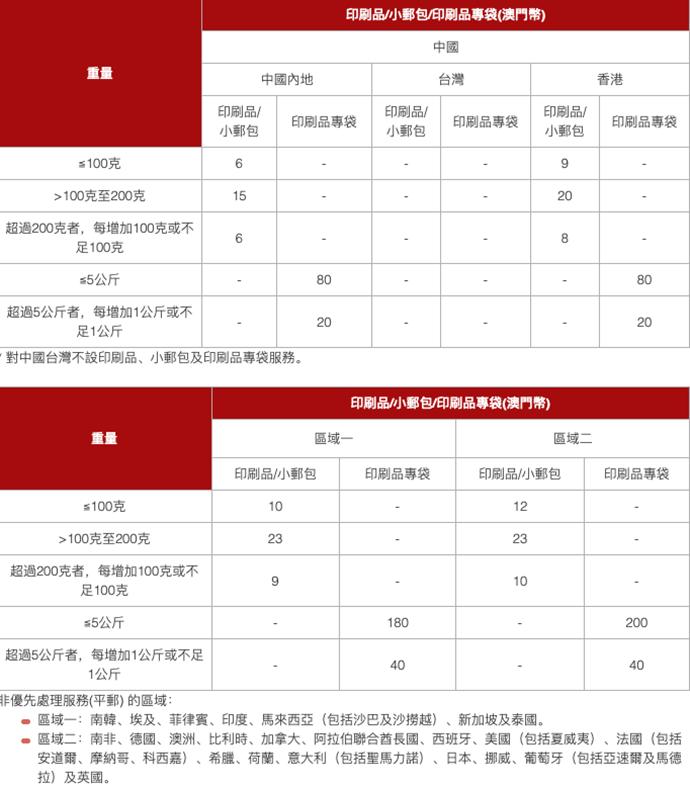 区域一 (例如:新加坡、马来西亚、菲律宾和泰国等) 函件的优先处理服务(空邮)基本邮费由澳门币5元调整至4元;