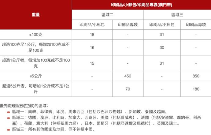 区域二的空邮基本邮费由澳门币23元调整至18元。