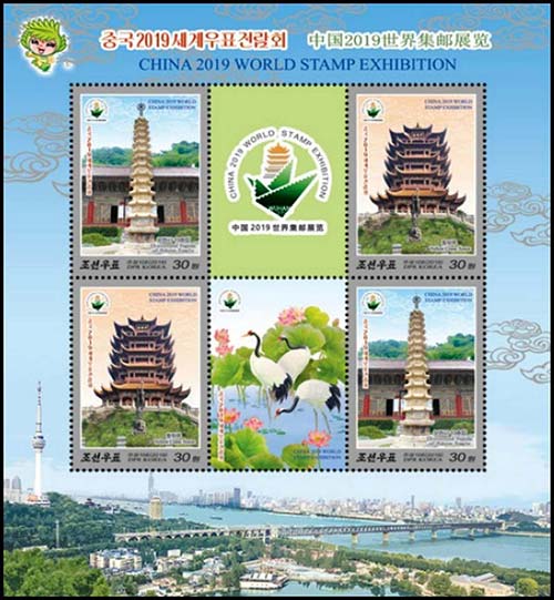 朝鲜邮政发行邮票2种,邮资片1种,图案选用两国的古塔,武汉黄鹤楼和平壤普贤寺古塔,朝鲜普贤寺的建于1042年,13层古塔是普贤寺的镇寺之宝,经历风雨沧桑,底座部分白石变成了褐色。普贤寺以24殿阁(243间)组成的朝鲜名刹,是朝鲜的文化瑰宝。初期,此寺是华严宗的一座寺院。后改为曹溪宗(禅宗)的一处福地,现在,寺内有大雄殿、万岁楼、观音殿等10多幢建筑。包括邮票,小版张(含邮票4枚,面值120朝鲜圆,约合0.95元人民币),武汉售价40元人民币,邮展邮资片面值30朝鲜圆(约合0.23人民币),武汉售价40人民币。