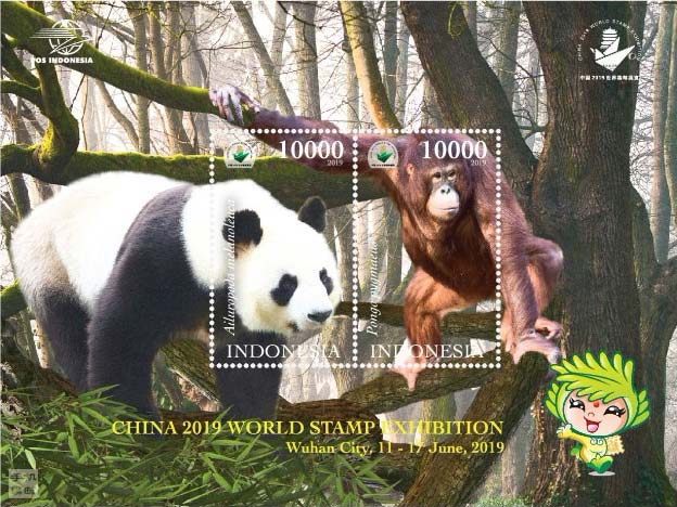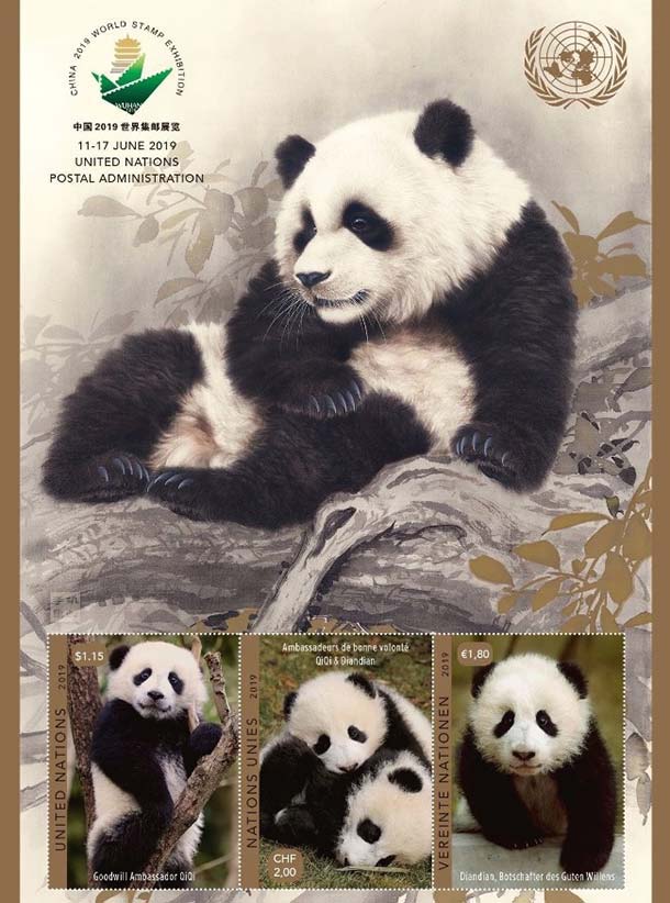 为纪念6月11日至17日在武汉举行的中国2019世界集邮展览,联合国邮政发行“联合国开发计划署全球首对动物大使”成都大熊猫基地的双胞胎“启启”和“点点”熊猫邮票小全张,纽约(美元)$1.15主图为大熊猫启启、日内瓦(瑞郎)CHF 2,00主图为大熊猫双胞胎合照、维也纳(欧元)€ 1,80面值的大熊猫点点