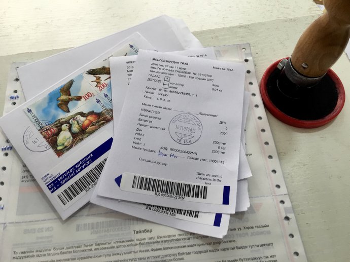 这是挂号收据,蒙古的挂号邮费是2300蒙图(约合7.7人民币),不过挂号费是不可以贴邮票来支付的,单独现金支付!