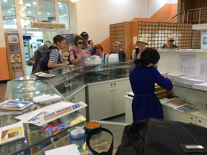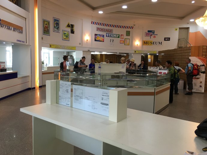进入邮局之后,就是宽敞的大堂,大堂中间就是集邮柜台了。这里出售邮票与明信片,还有一些纪念邮册。柜台前挤满了来自各国的游客,都是来邮寄明信片的。这天恰逢蒙古国那达慕大会开幕,游客非常多,乌兰巴托市内的商店至少有一半都关门了,不过中央邮局还是坚持营业!