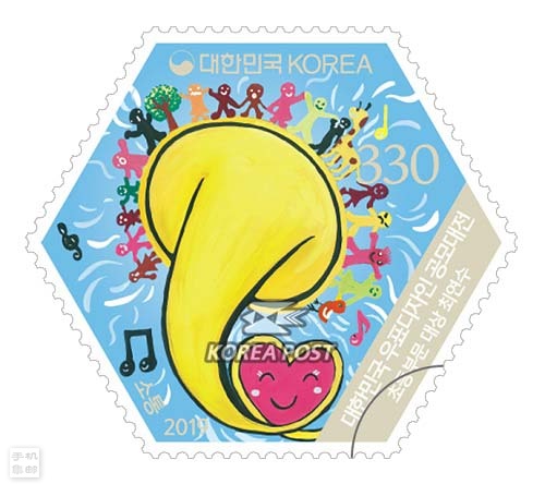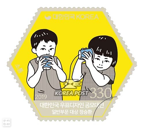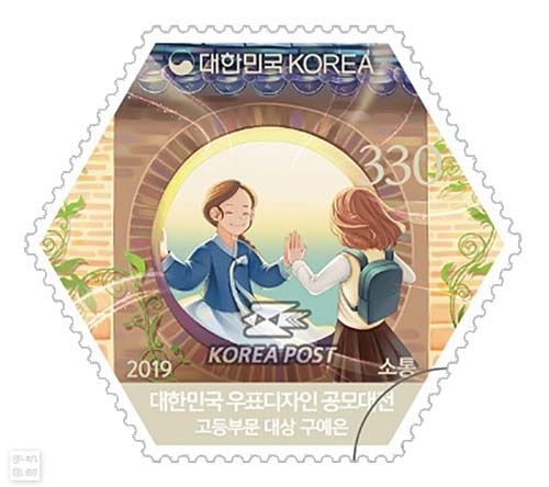 韩国2019年1月23日发行《韩国邮票设计大赛》系列邮票,2018年大赛的命题创作主题为“沟通与双赢”,作品遴选自各组别的获奖作品,除了小学组、中学组、高中组和成人组的手绘作品外,这次还增设了AI组的大奖作品,AI是人工智能的英文简称,通过机器学习,应用软件与硬件结合来完成图像制作,5枚邮票面值均为330韩元。