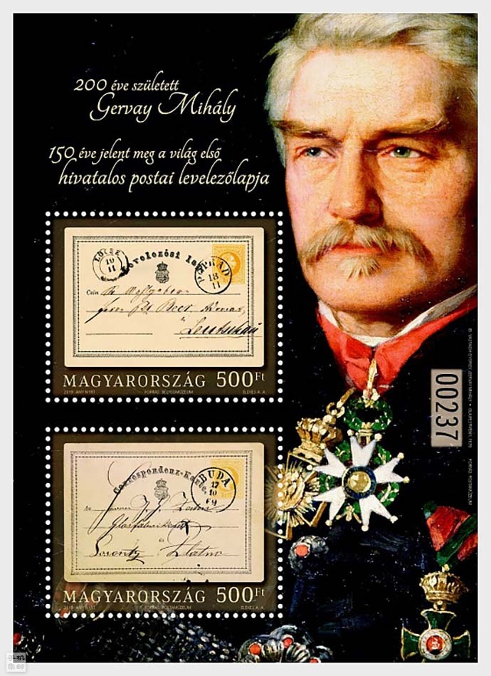世界第一枚邮资片诞生于1869年,德国海因里希·冯·史蒂芬曾在1865年建议德国邮政发行“POSTBLATT”(一种公开书写信息的明信片),作为信函的廉价替代品,但出于对隐私的担忧,遭到批评家们的反对。在1867年~1888年时任匈牙利邮政局长的米哈利·格伟(1819-1896)的积极推动和主导下,邮政网络进行了重组,职员人数大大扩增,匈牙利语成为邮政官方语言,当时的匈牙利和奥地利在1869年10月1日发行了以匈牙利语和德语印制的两个版式邮资明信片(图1),由于明信片邮资低廉,使用方便,深受大众的欢迎,第一天就售出10000份。明信片正面下方供书写收寄件人姓名和地址,正面右上角印有奥匈帝国国王为图案的邮资符志,背面供书写通信内容。为纪念这一创举,塞尔维亚邮政于2019年10月8日发行纪念邮票1枚(图2),捷克邮政于10月1日发行纪念邮资片1枚(图3),匈牙利邮政于5月9日发行纪念邮票小全张1枚(图4),小全张边纸为今年恰好200年诞辰的米哈利·格伟。(晨阳文)