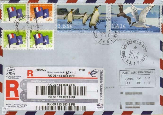 法属南极基地2018年做了2封,一封是由法国南极科考站迪蒙·迪维尔站(图1)寄出,该科考站创建于1956年,值得注意的是此封除不够邮资但当成挂号寄出外,还在路上被水浸泡形成水渍。另一枚贴法属凯尔盖朗岛与格陵兰联合发行的邮票(图2)从位于南纬48°30′─49°30′、东经68°42′─70°35′之间的凯尔盖朗岛,离南极大陆仅1400公里的法兰西港寄出,岛上栖息着成群的海象和企鹅,邮路都花了半年才到达。