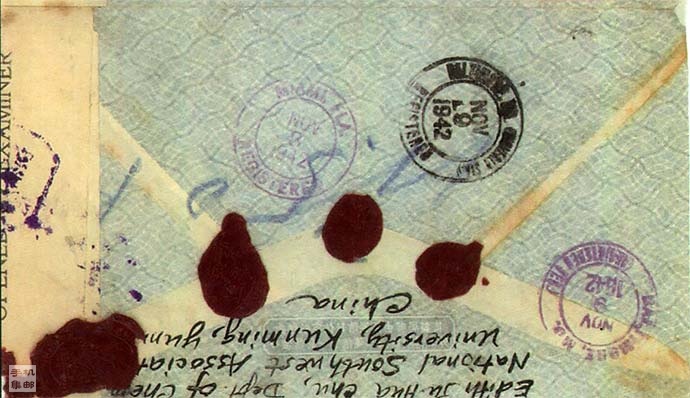 封二,是我的旧藏,为1942年10月4日由云南昆明寄美国航空挂号信,是162X92毫米之西式四边加印蓝色波浪条纹及飞机图案之航空封,邮资为11.50元(国际平信1.00元、挂号费1.00元、航空附加费9.50元)贴国父像香港大东版5.00元票2枚,1.00元、0.50元票各一枚,邮资符合,销昆明双地名中英文日戳(1942.10.4)走新开辟之驼峰航线,运至印度加尔各答,经剪开检查通过后,加贴白色封条标签及加盖直式八角型内有皇冠标志之DHF9检查戳记,也在封条之正面、后面和封背封口加上火漆三大块和三小块,各盖上与前封同式之检查钢戳,但其戳码字型已改为A,稍有异于前封于同年11月9日到达,封背销有美国之落地戳及投递戳,也是一件既完整又特殊之海外飞鸿。