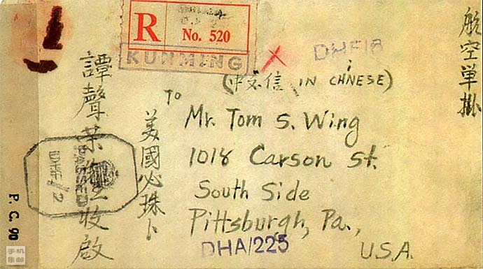 图:1945年3月2日由昆明寄美国航空挂号信