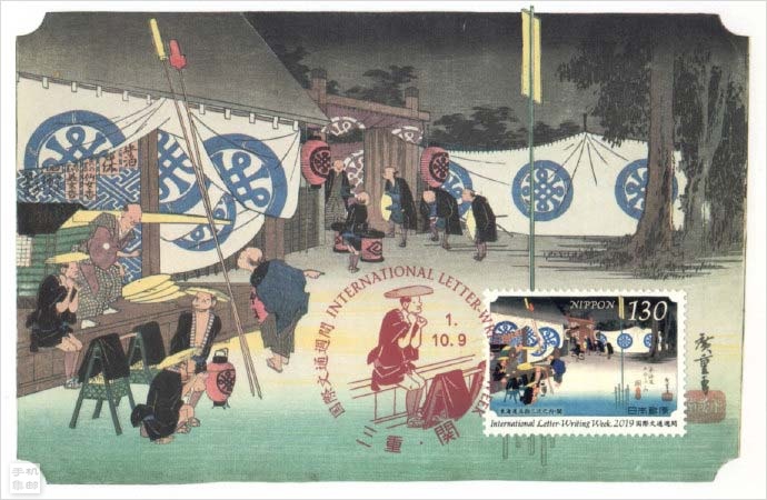 日本依照惯例在每年世界邮政日发行系列邮票,2019年10月9日发行邮票6种,均为歌川广重绘画作品,前3种小票幅选取花鸟画图案,分别为歌川广重所绘的《鸳鸯》面值 7 日元,歌川广重所绘的《海棠に 小鸟(1)》面值 70 日元和《海棠に小鸟(2)》面值 70 日元,后3种选取现藏于平木浮世绘美术馆,歌川广重的《东海道五十三次》 系列浮士绘(保永堂版),面值 90 日元为静冈“日坂” (图1)、面值 110 日元为名古屋“鸣海”(图2)、面值 130 日 元为三重“关”(图3)。描绘日本旧时由江户(今东京)至京都所经过的 53 个 宿场(驿站)。歌川广重1797年出生在一个服务于德川军政府的低级武士家庭。年轻时从师于画家歌川丰广,在其师去世之后,他转向风景画和花鸟画。